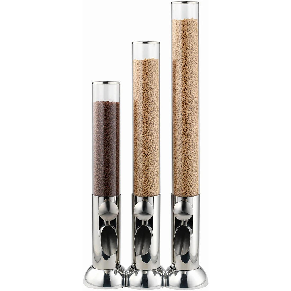 Dyspenser wyposażony jest w pojemnik z akrylu, pokrywę i oś obrotową wykonane z wysokiej jakości stali nierdzewnej. Model Hopper został zaprojektowany w taki sposób, aby zapewnić stabilną i solidną konstrukcję. Dyspenser u góry posiada pokrywę umożliwiającą wygodne uzupełnienie pojemnika a dzięki przezroczystym ściankom doskonale widać jego zawartość. Wysokość dystrybutora wynosi 82,5 cm, co czyni go idealnym do wykorzystania w kuchni, restauracji, hotelu czy na przyjęciu. Prezentacja muesli jeszcze nigdy nie była tak prosta i elegancka! Produkt na zamówienie.