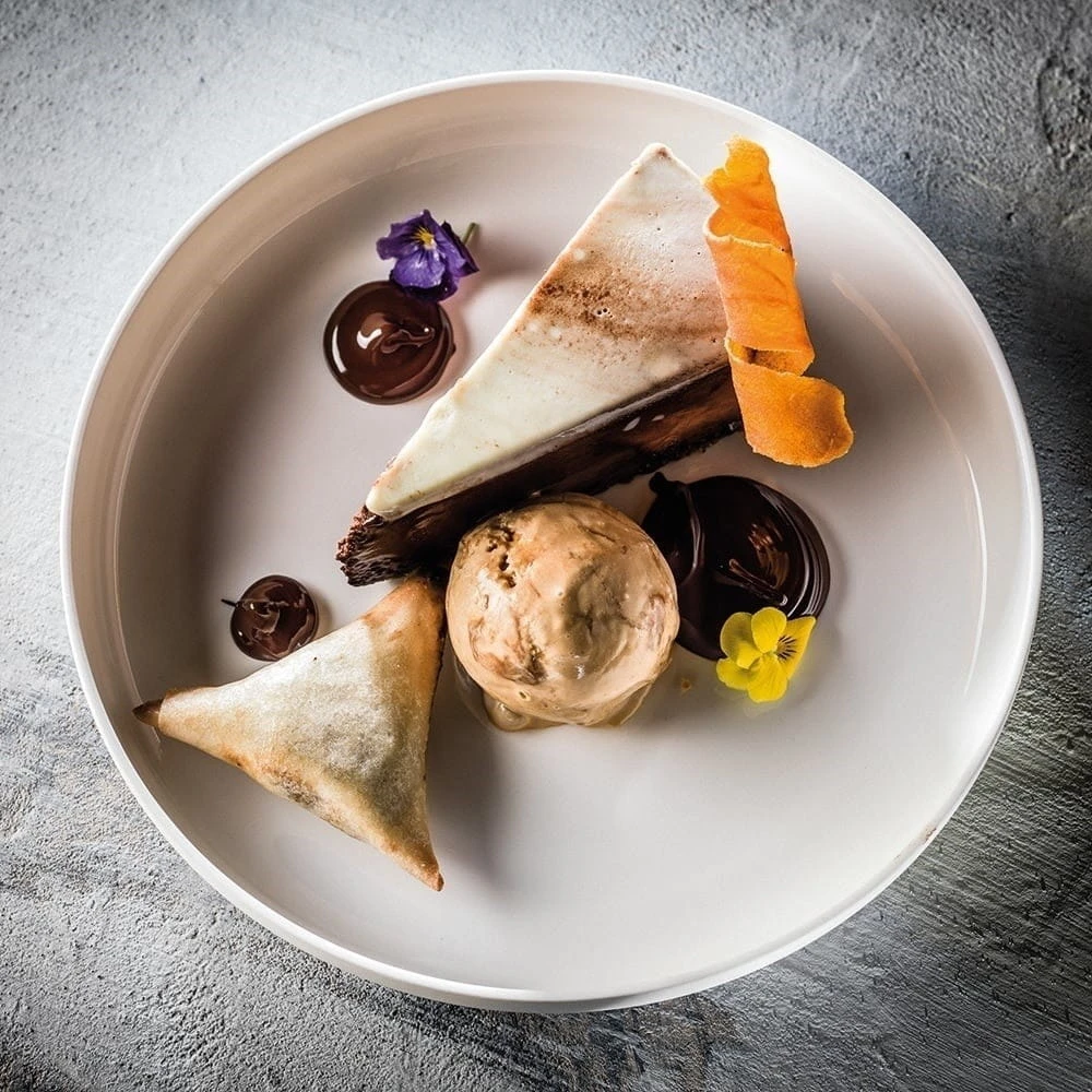 Kolekcja białej porcelany szkliwionej z rantami Serax Base to bardzo atrakcyjna propozycja do dań z karty. Seria składa się z talerzy ze średnim rantem i wysokim oraz misek do zupy, przystawek, makaronów i deserów. Talerz 24 cm średni rant 3 cm, pakowane po 4 sztuki