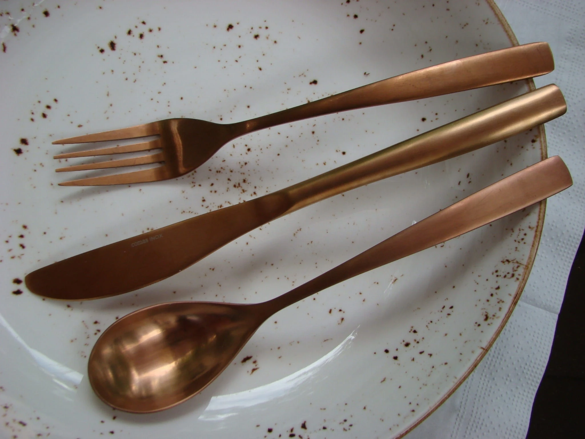 Seria Copper Comas wyprodukowana jest ze stali nierdzewnej z powłoką miedzianą. Sztućce mają 3 mm grubości. Można myć w zmywarce. Noże osobnym cyklem. Widelec pakowany jest po 12 sztuk. Długość widelca 200 mm